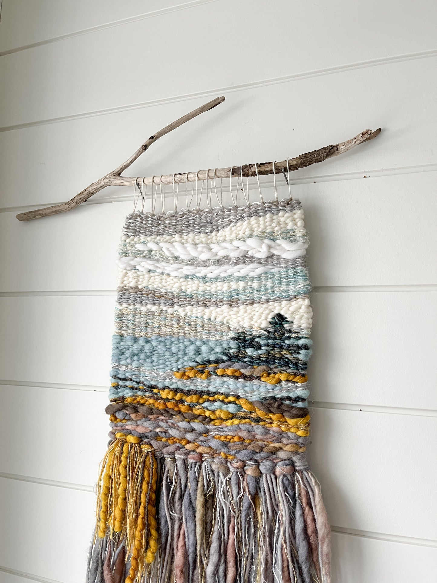 Materials: cotton warp with weft of local hand dyed slubby mix, Blue Face Leicester, merino, cashmere, silk, linen, mohair, Scandinavian wool, wool roving, and more. Mounted on driftwood.