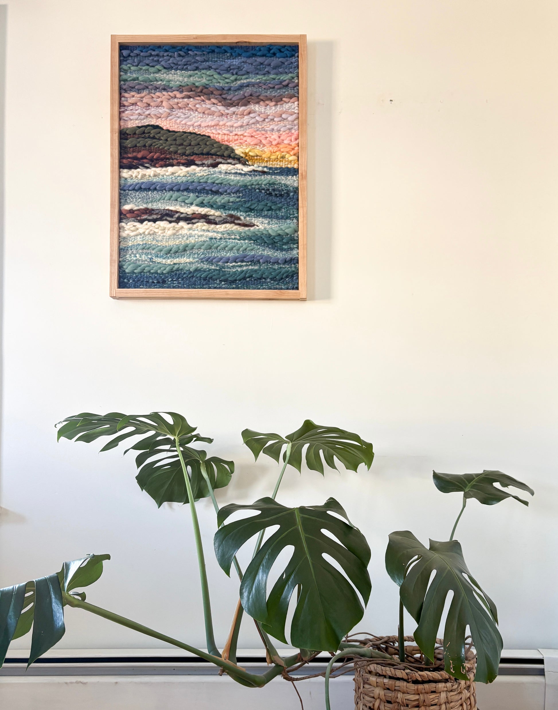 Handwoven textile artwork designed and created by artist, Mary Anne Donovan, framed in ash. This artwork captures a colourful sky over the crashing waves of the Atlantic Ocean along Canada’s east coast. The setting sky is a natural reflection of the colourful towns and artistic flavours of the places the artist has called home ~ St. John’s, Newfoundland and Lunenburg, Nova Scotia.