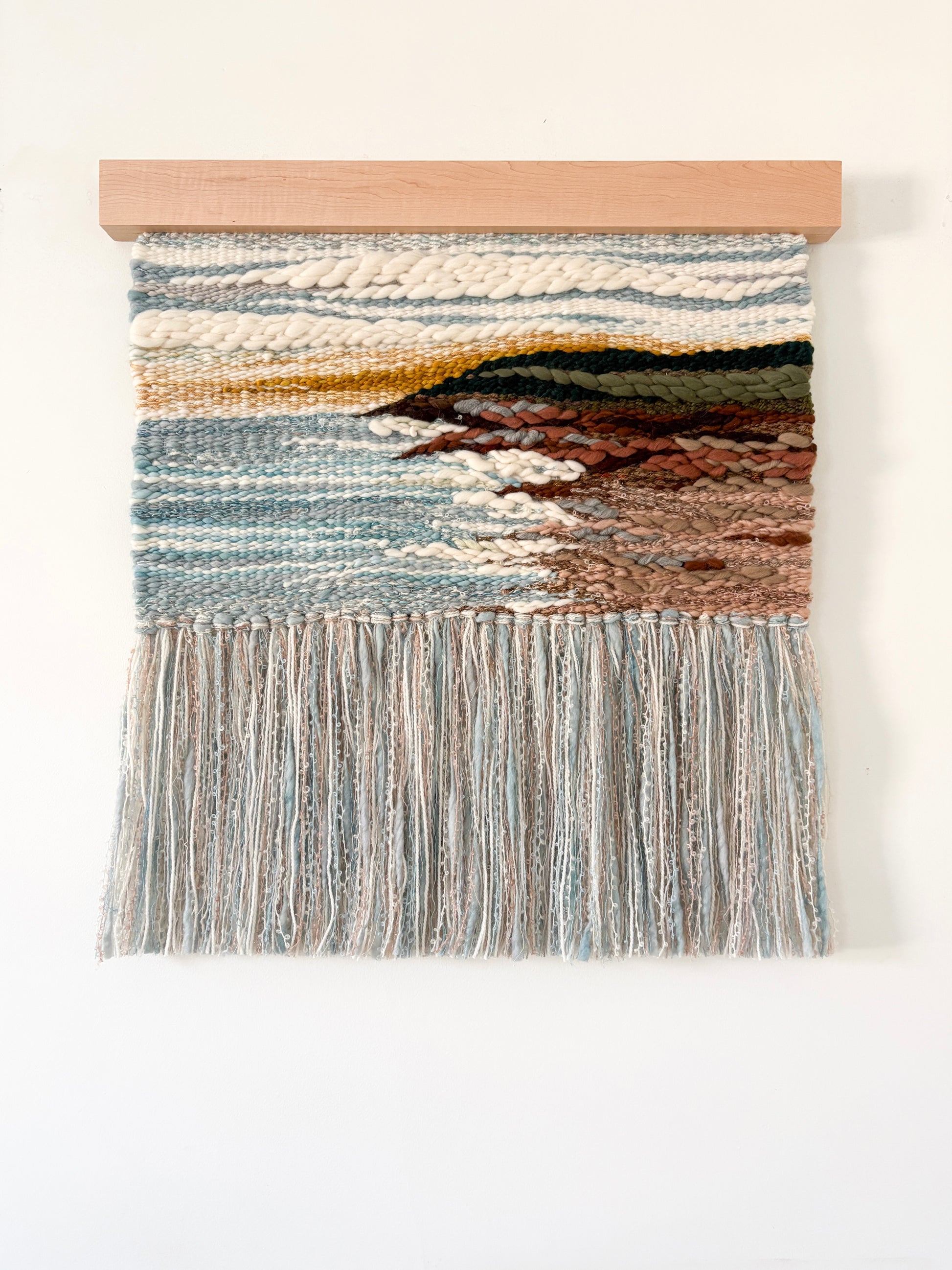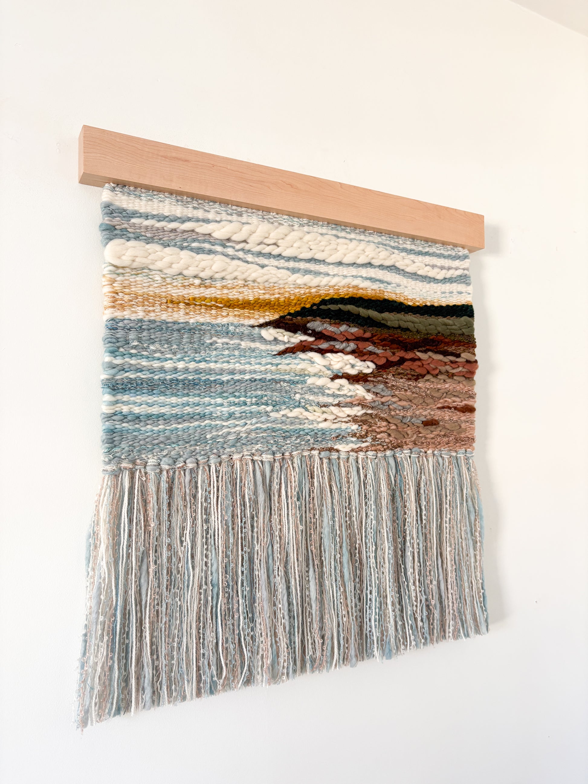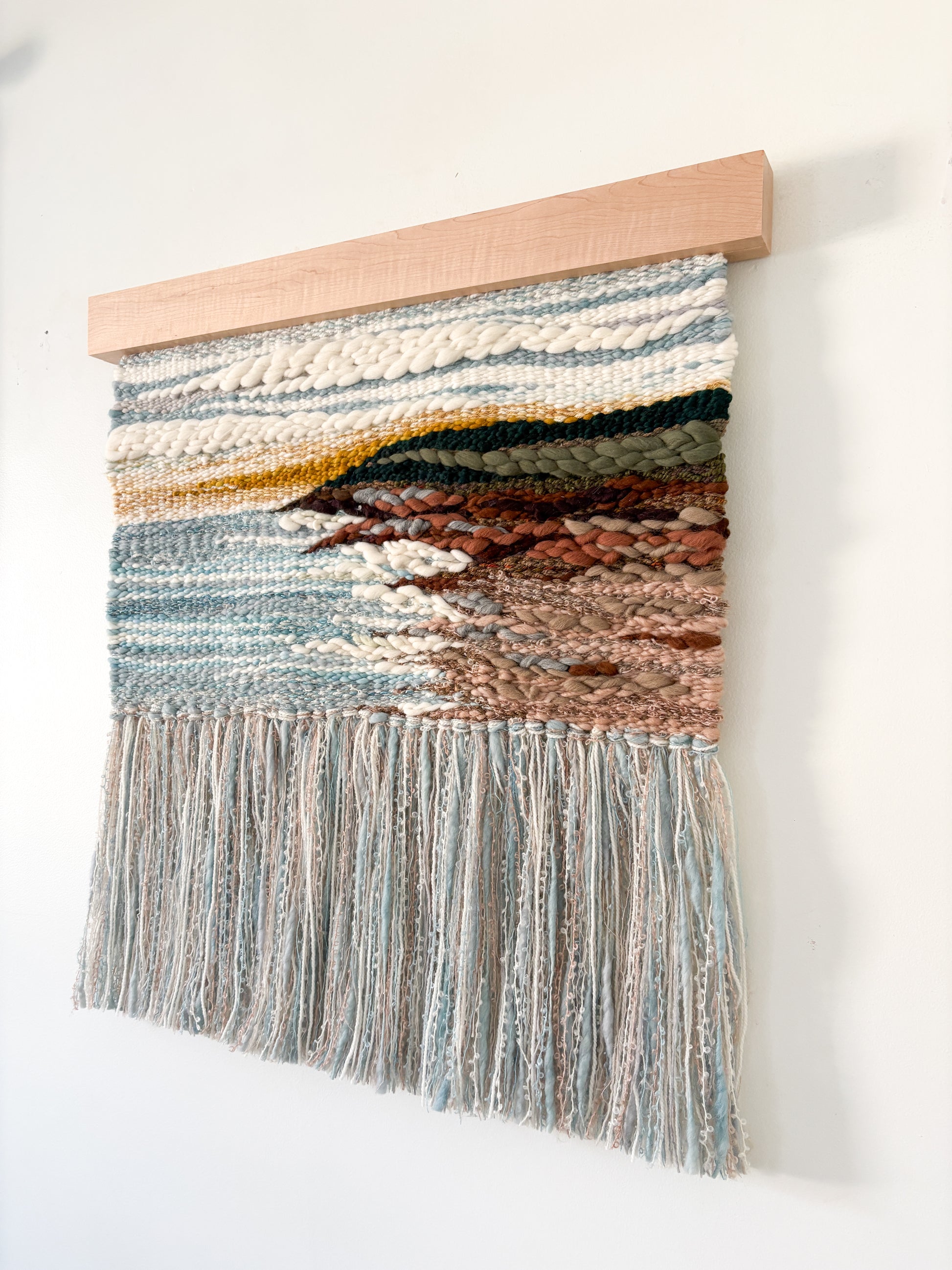 Materials: cotton warp with weft of local hand dyed silk, merino, mohair, cashmere, alpaca, wool roving, and more. Mounted on locally crafted maple holder.
