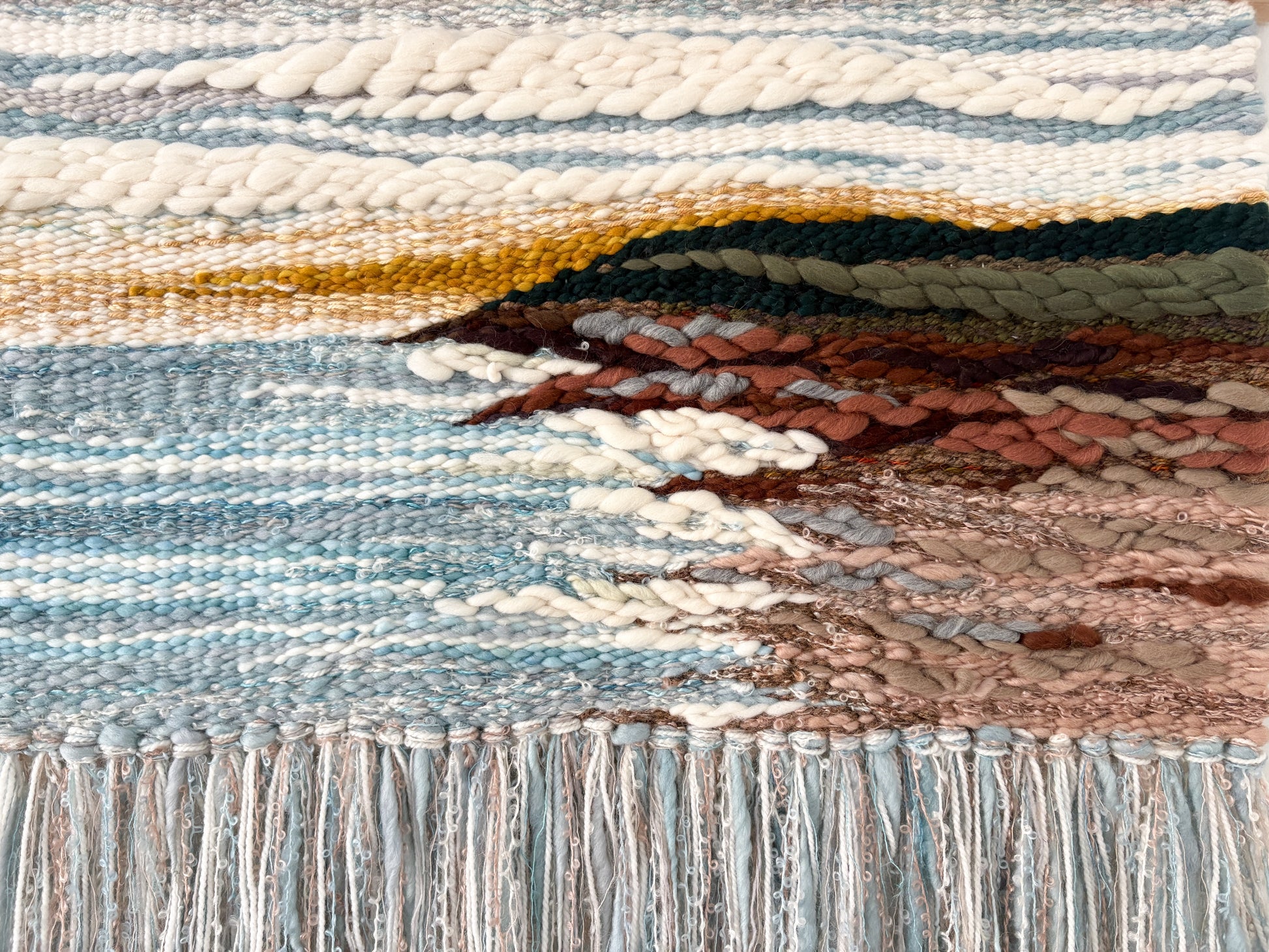 Original textile artwork depicting an Atlantic Canadian coastal sunset. Rich in texture and created from the inspiring transitional day into evening moments spent exploring the eastern shoreline. Designed and handwoven by Lunenburg artist, Mary Anne Donovan.