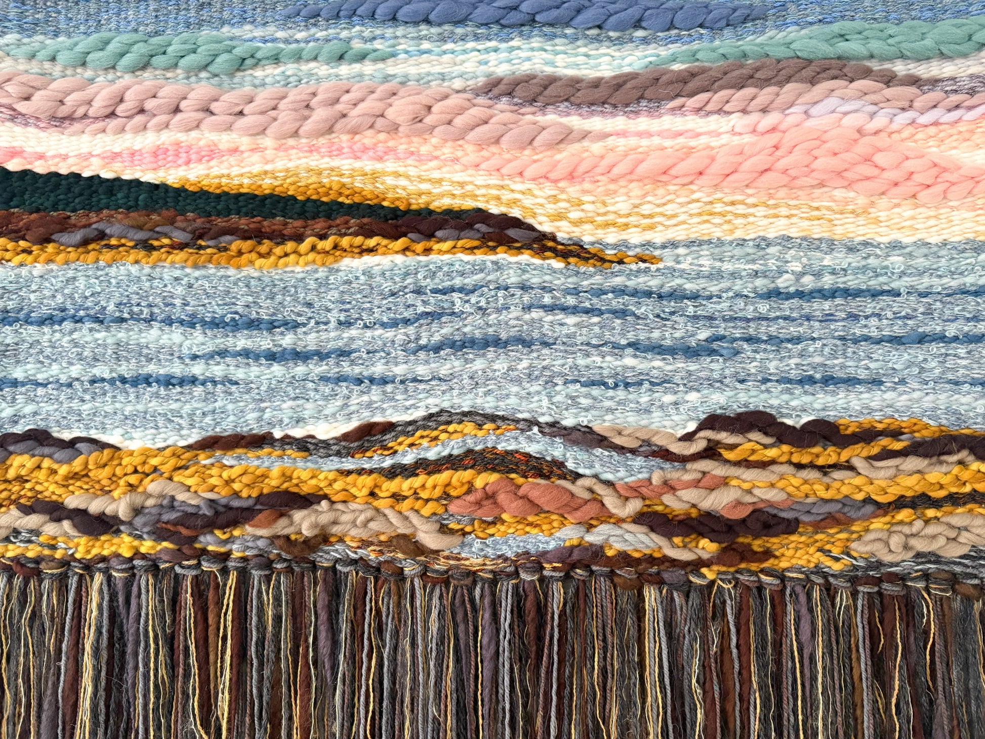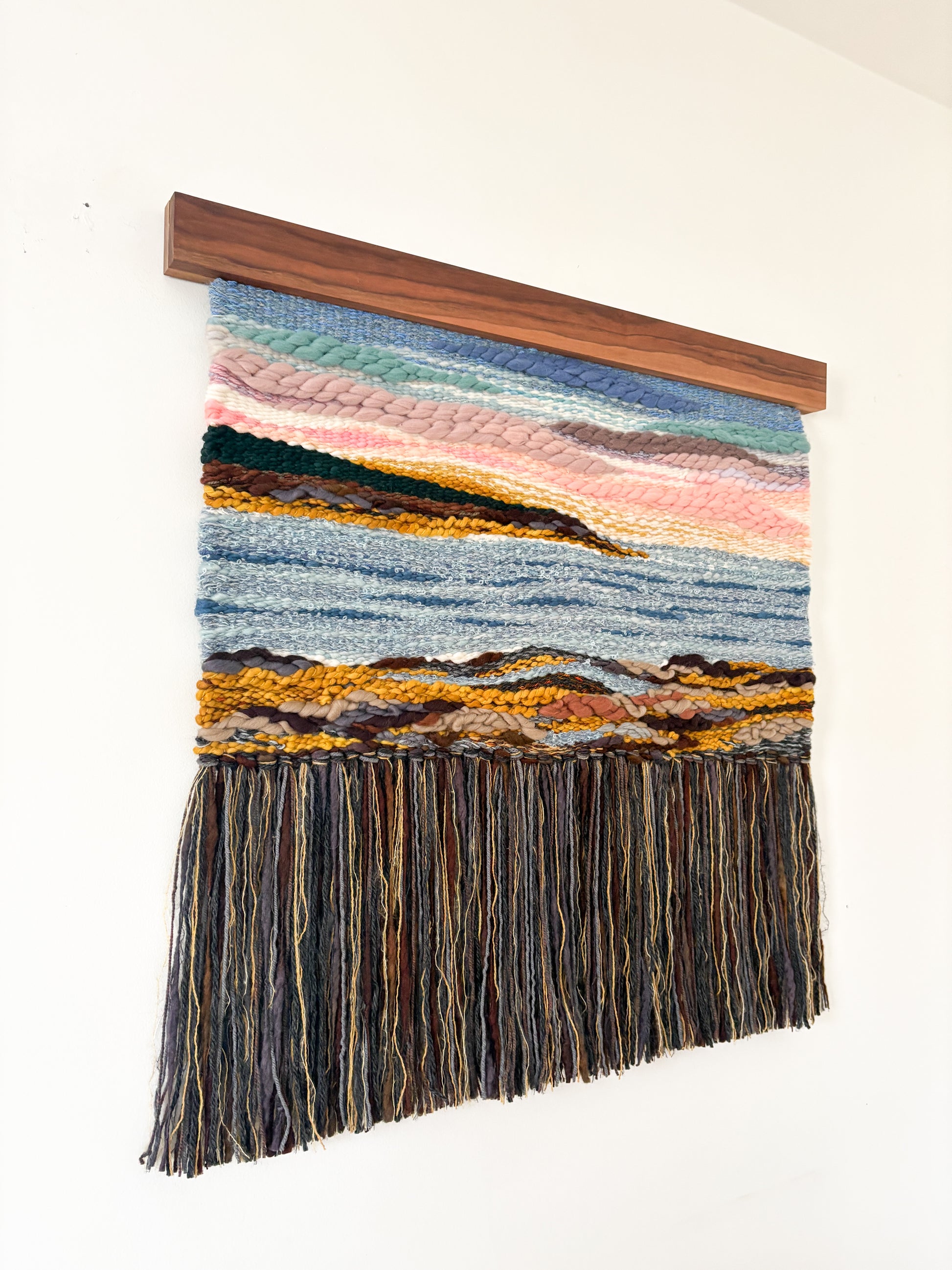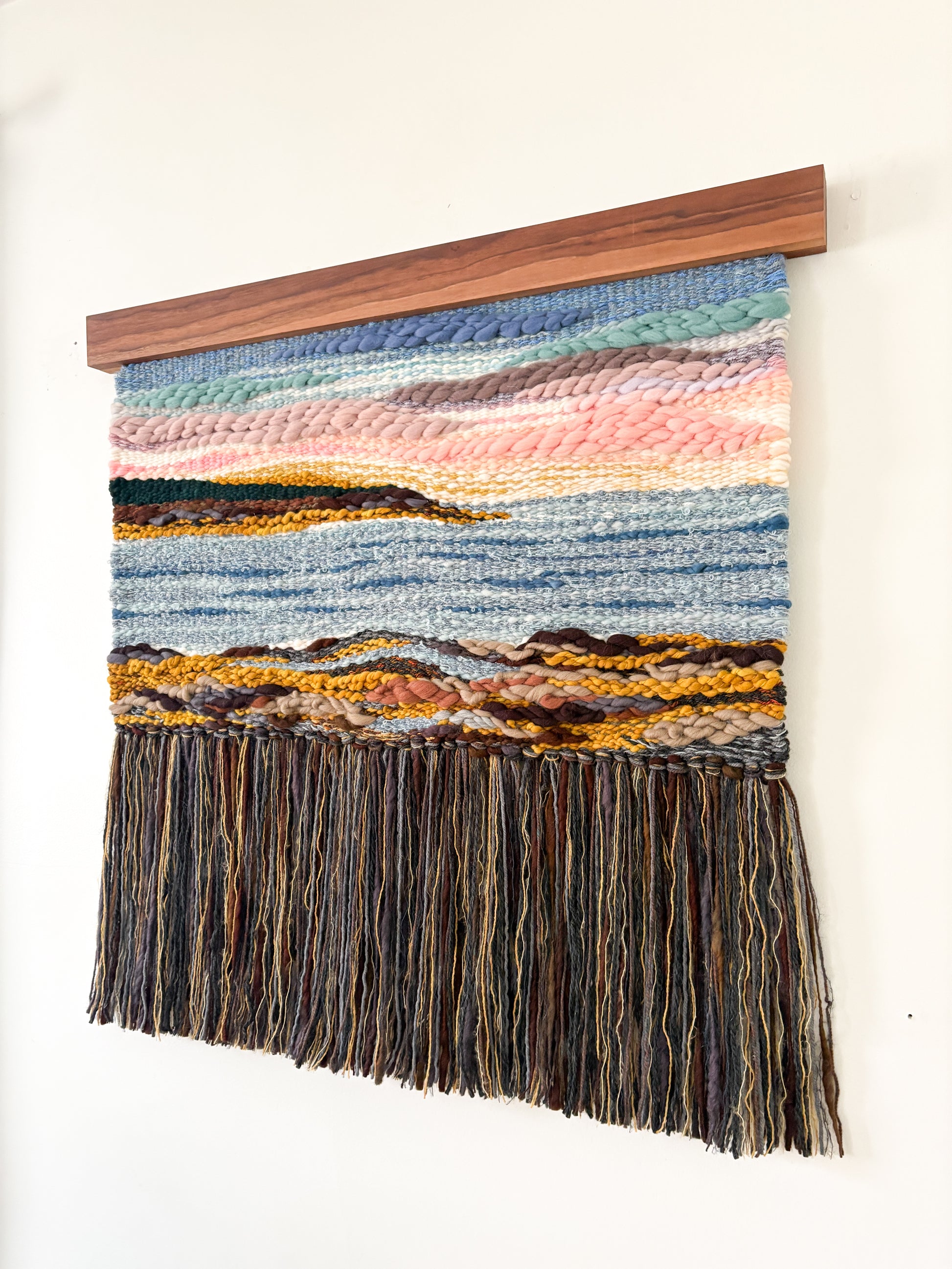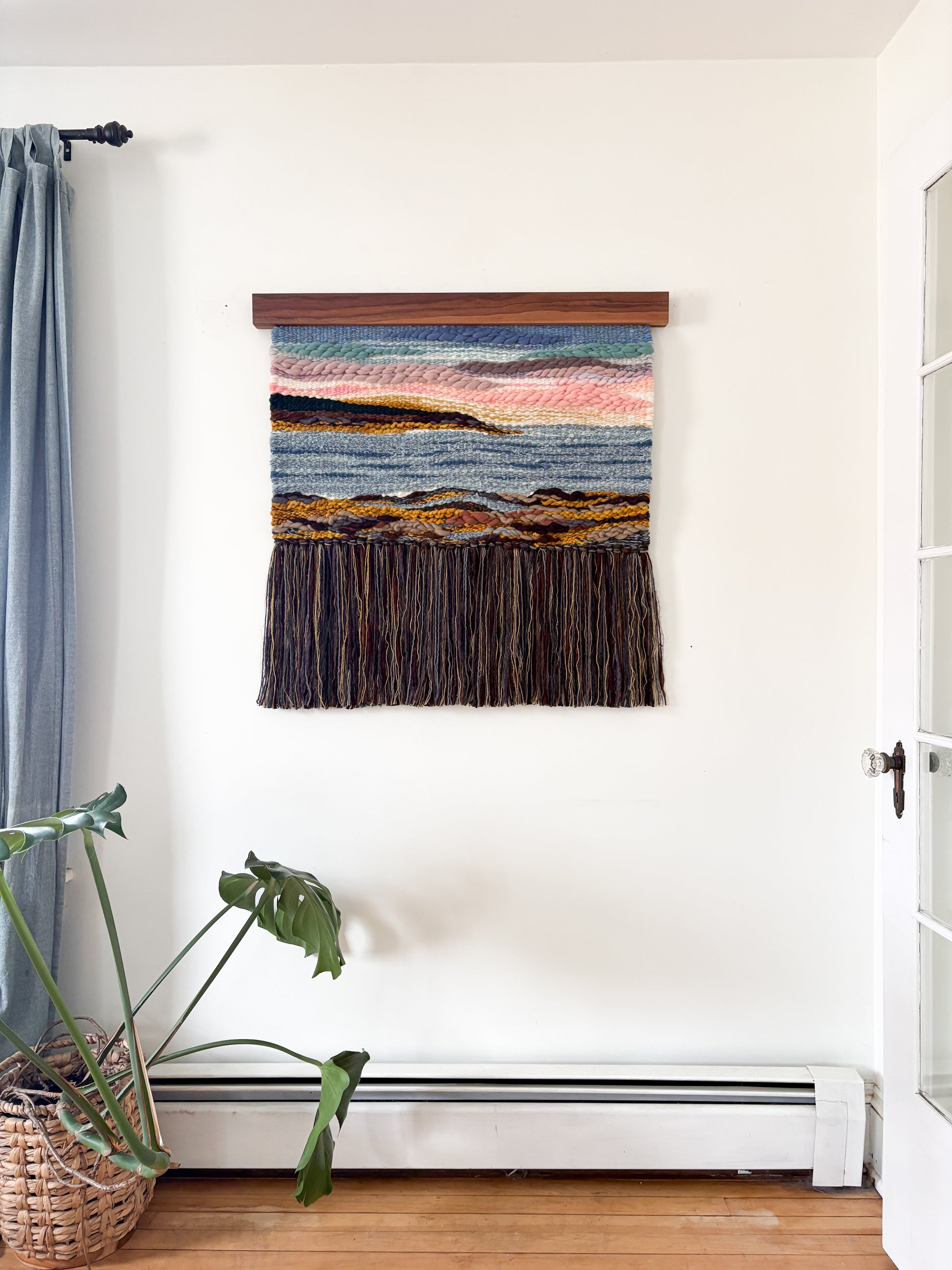 Original textile artwork depicting an Atlantic Canadian coastal sunset. Rich in texture and created from the inspiring transitional day into evening moments spent exploring the eastern shoreline. Designed and handwoven by Lunenburg artist, Mary Anne Donovan.