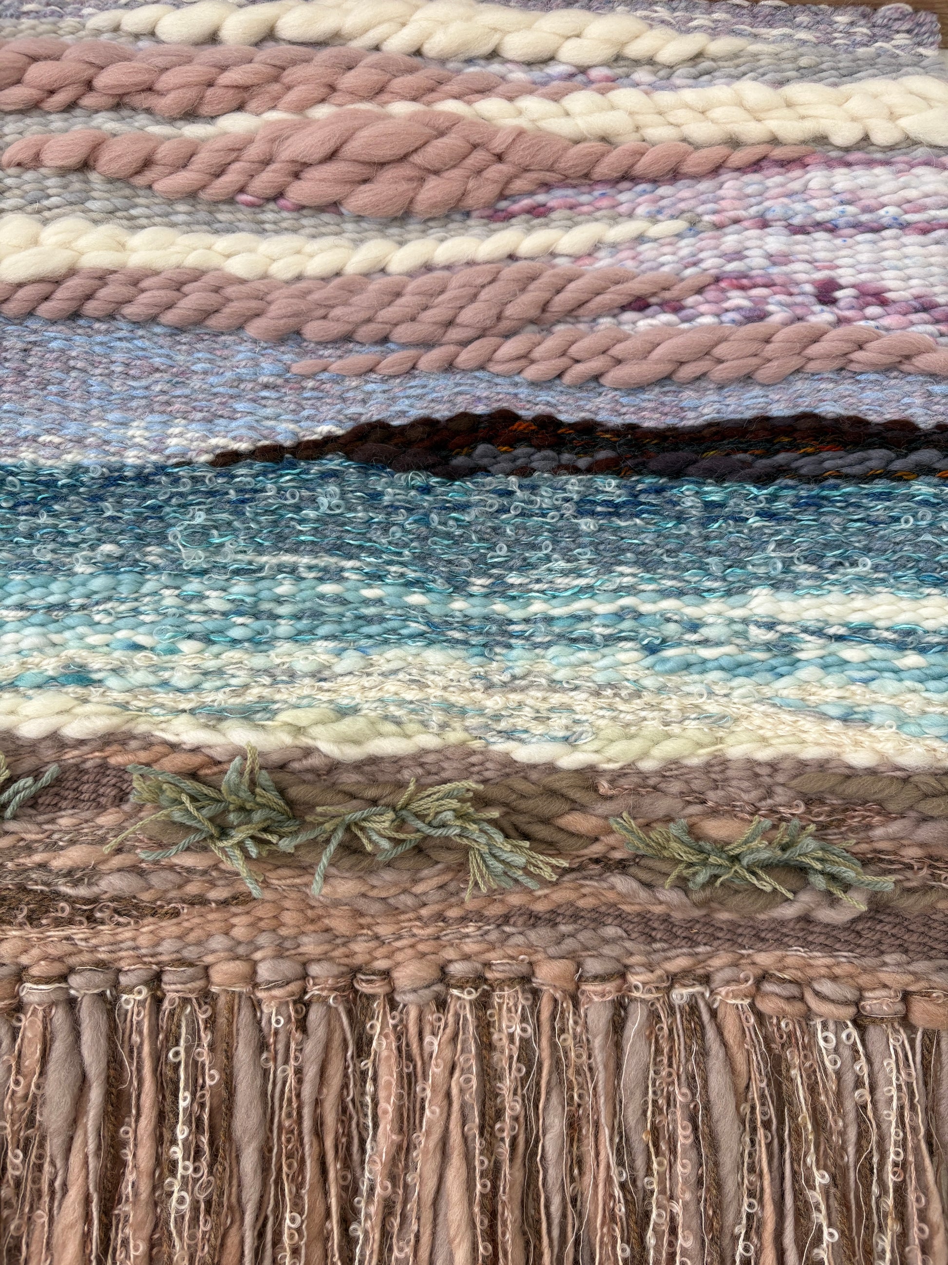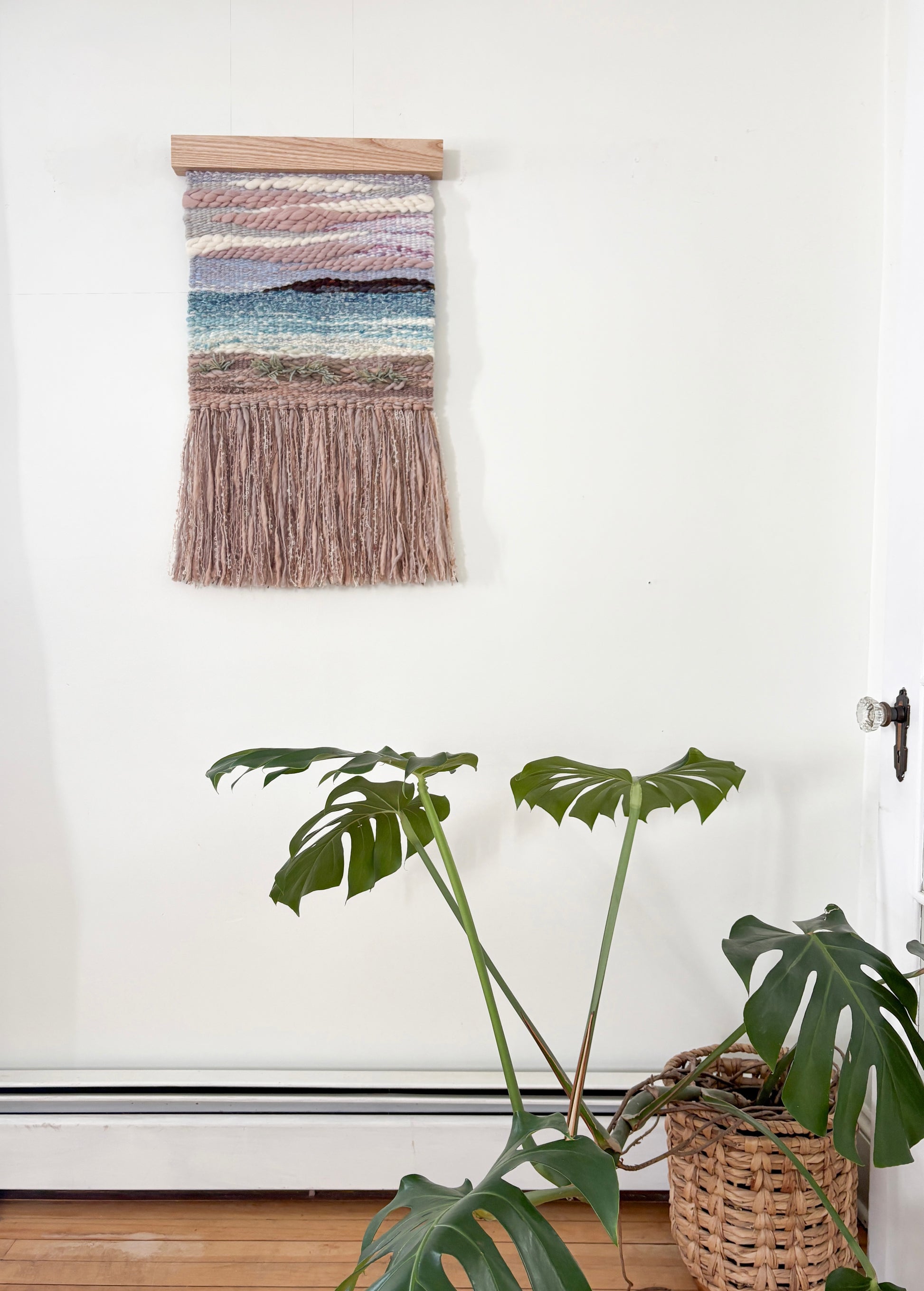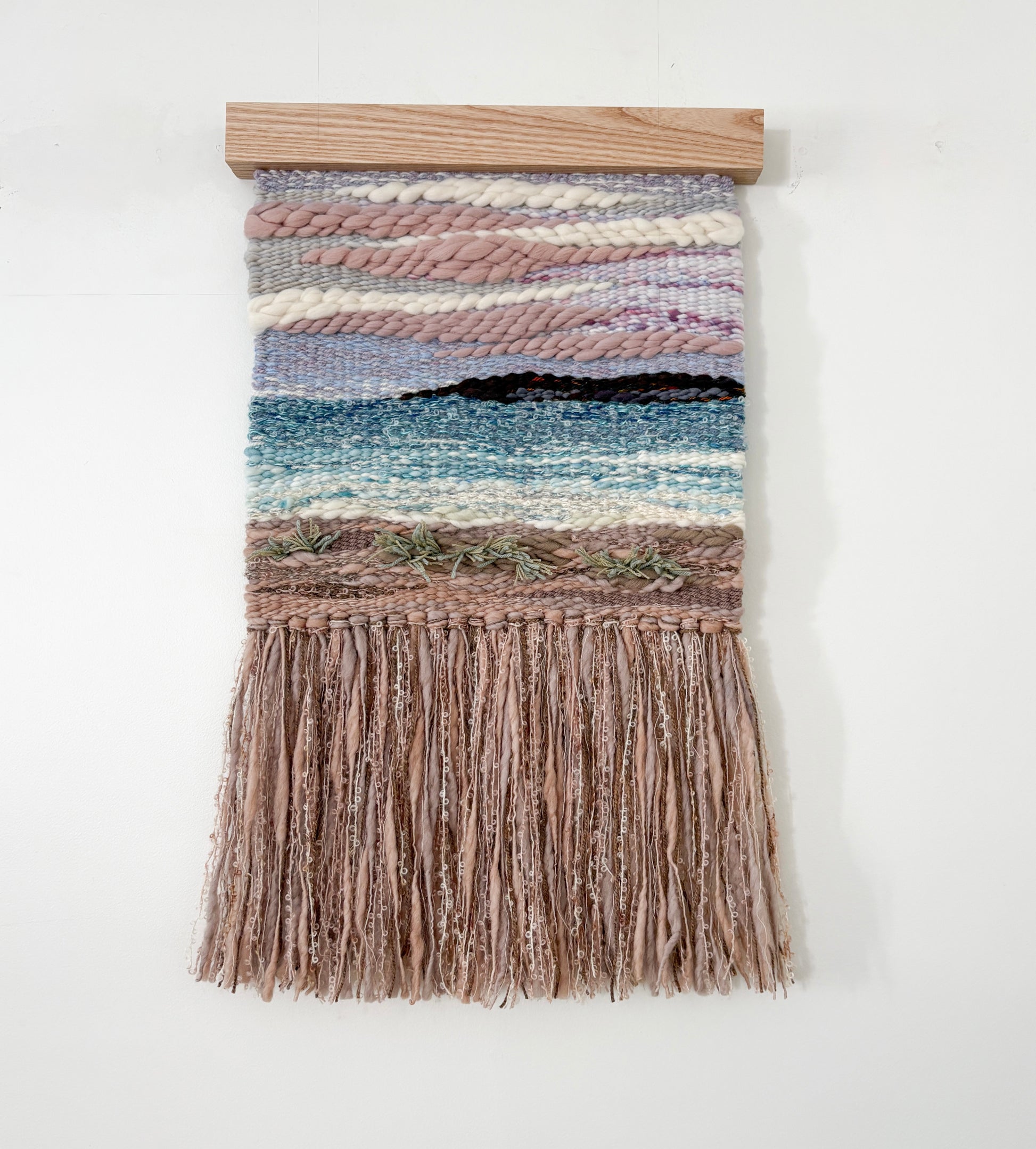 Original textile artwork depicting an Atlantic Canadian coastal sunset. Rich in texture and created from the inspiring transitional day into evening moments spent exploring the eastern shoreline. Designed and handwoven by Lunenburg artist, Mary Anne Donovan.