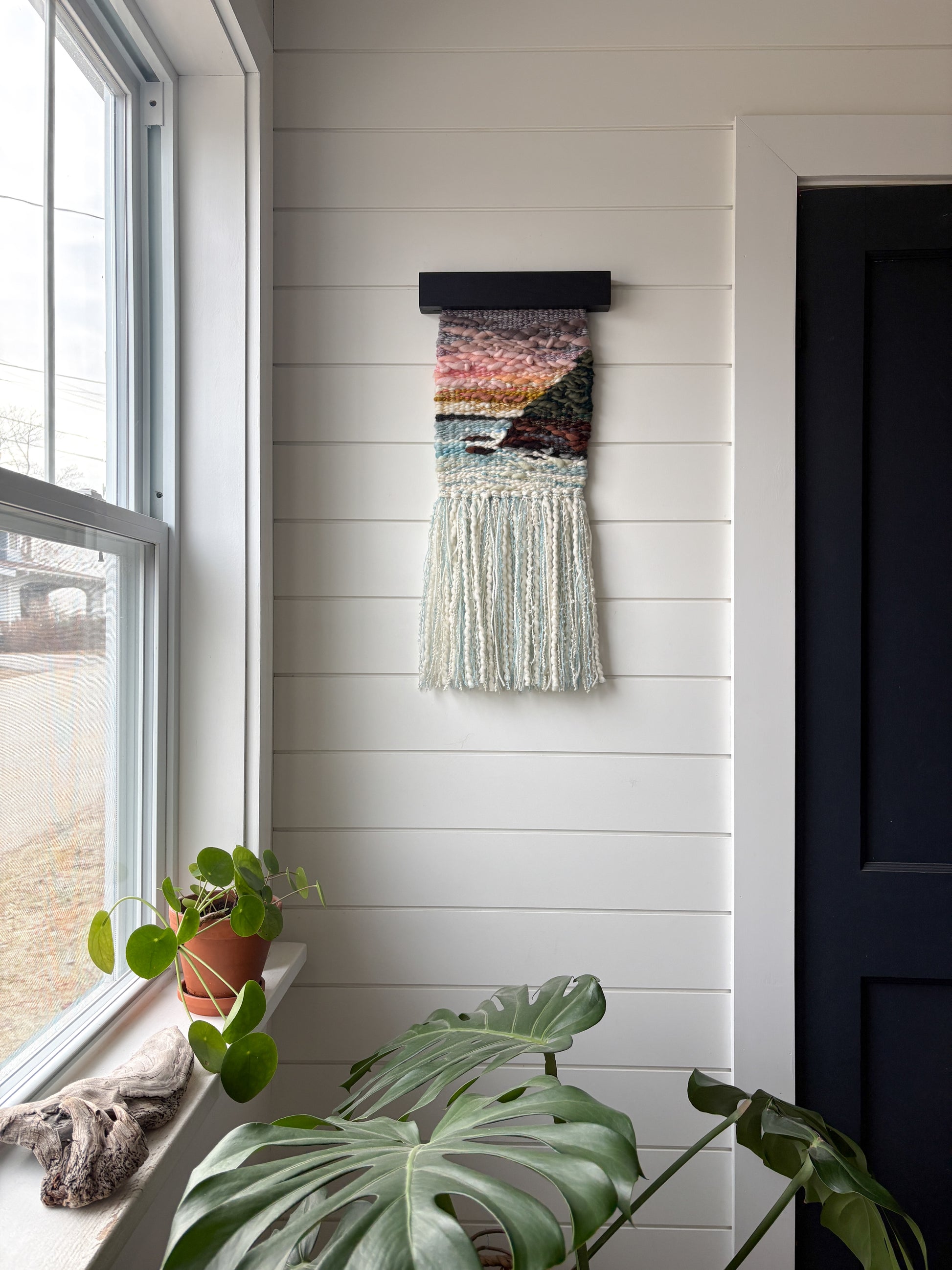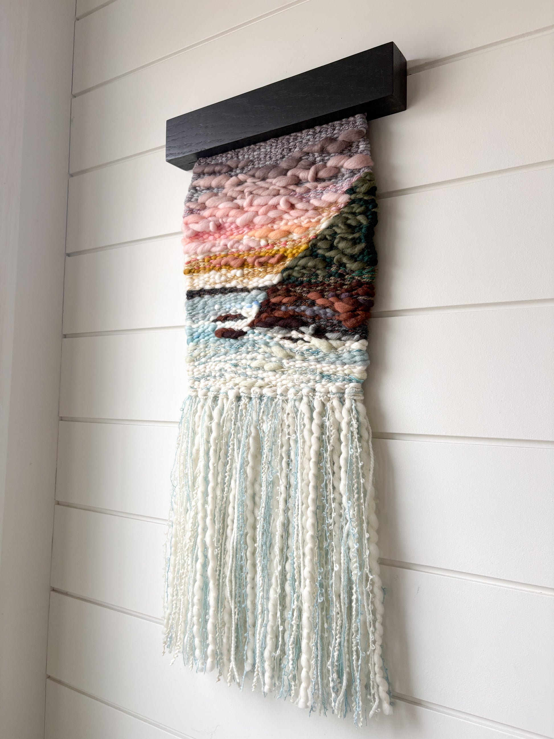 Original textile artwork depicting an Atlantic Canadian coastal sunset. Rich in texture and created from the inspiring transitional day into evening moments spent exploring the eastern shoreline. Designed and handwoven by Lunenburg artist, Mary Anne Donovan.
